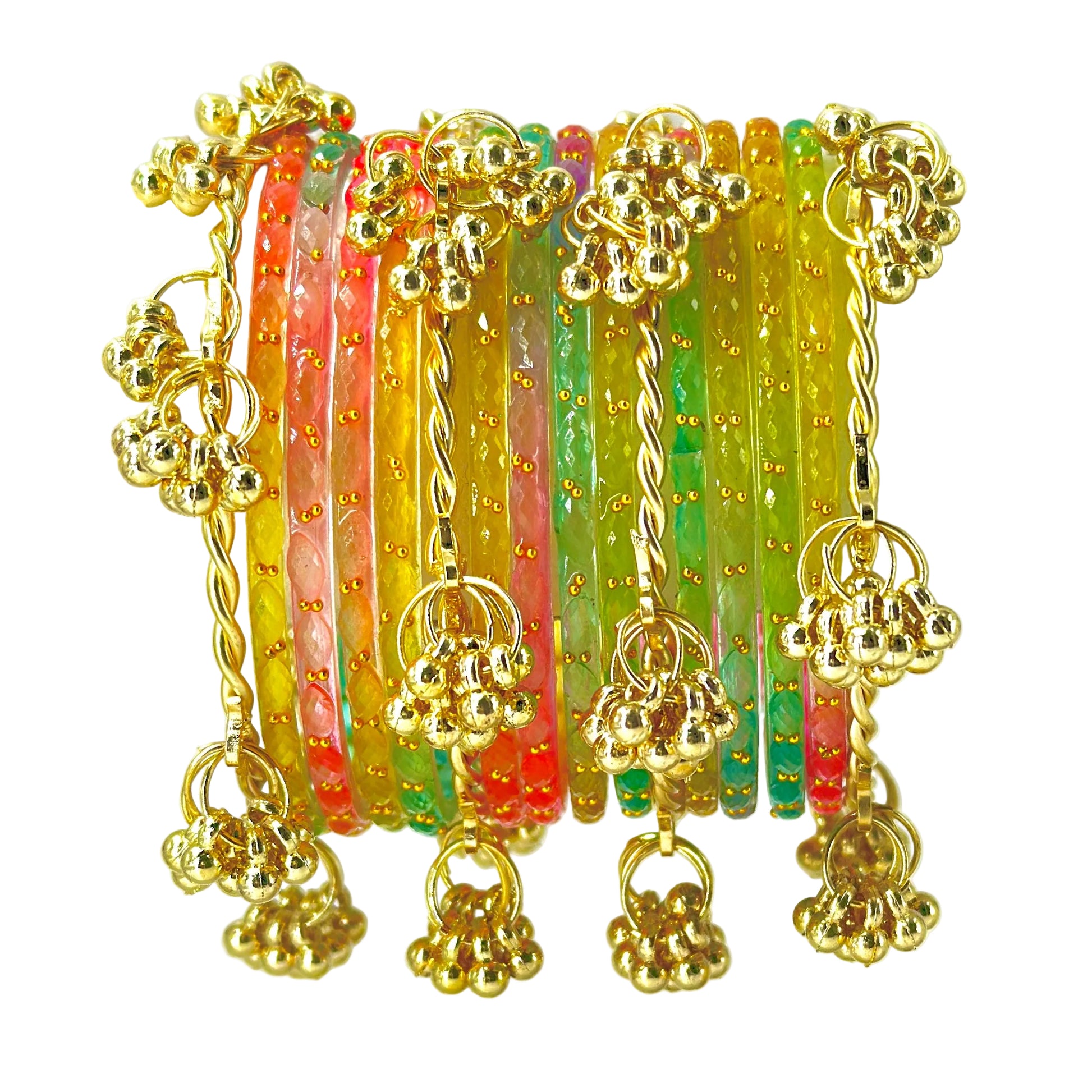 Dominate the daytime festive look with massive viral volume. This 16-piece Raindrop light multi stack features bright, translucent glass filler bangles with a unique faceted cut-glass texture designed to reflect sunlight. Each piece is delicately studded with tiny golden dots for a premium touch. To complete the viral aesthetic, this set is anchored by four heavy, twisted-wire Kashmiri ghunghru bangles loaded with golden bead clusters. This combination delivers a loud, rhythmic sound and massive wrist presence. Perfect for Haldi ceremonies, Mehendi, and daytime functions, this heavy set effortlessly matches every bright outfit in your wardrobe.